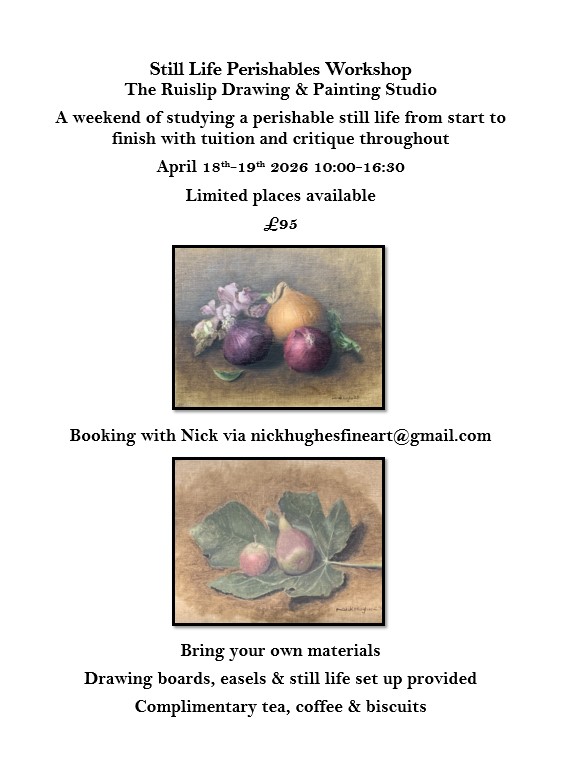 Come and study with Nick at his purpose built studio in Ruislip where you can either join the core curriculum drawing and painting course full or part time tailored to your calendar or why not attend a short workshop covering drawing the figure from life, still life painting workshops and more……